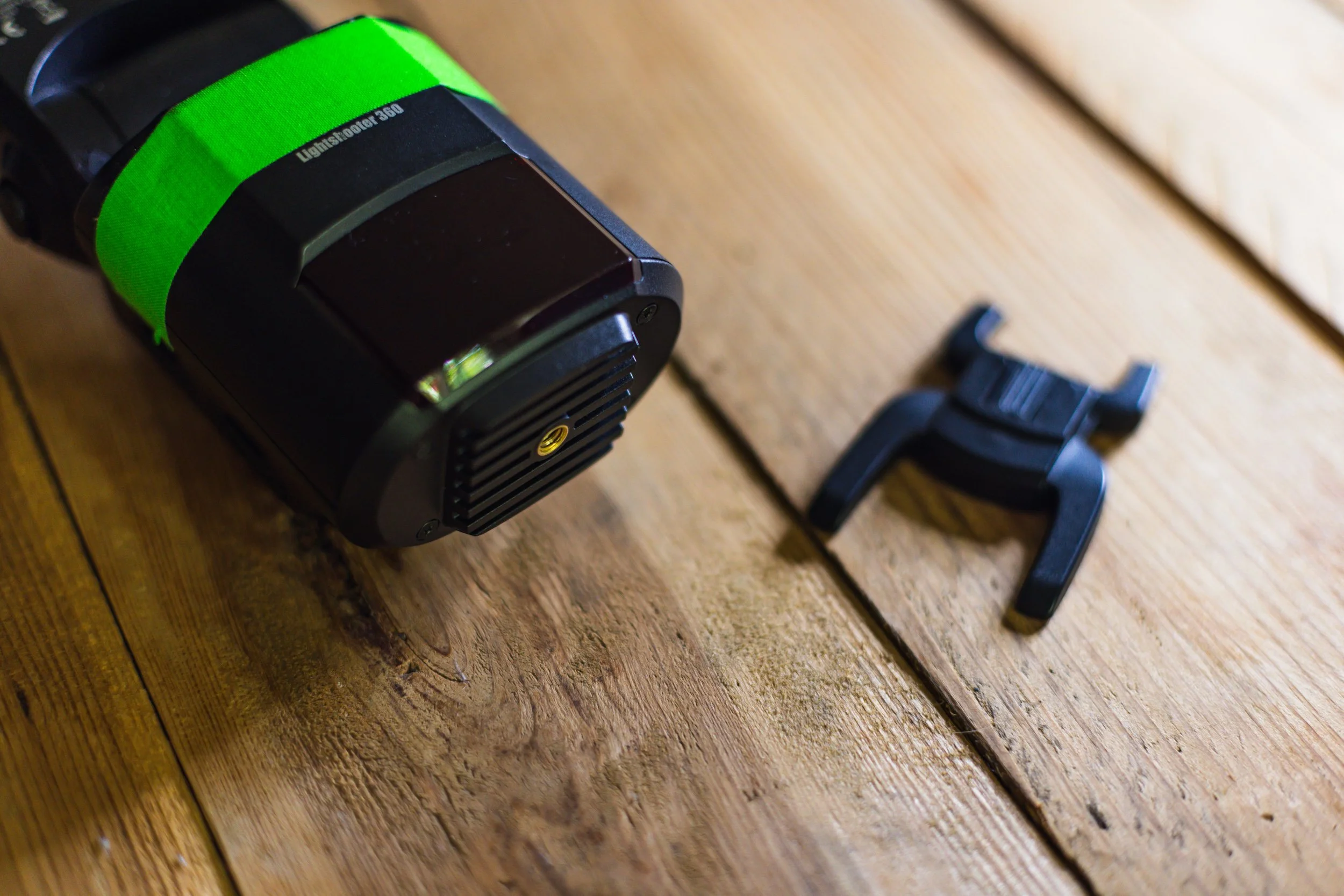 Dann gab es noch eine kleine Halterung dazu, mit dem ich von der Blitzschuh Aufnahme auf ein Stativgewinde komme. Das hat nicht besonders lange gehalten, mir wäre fast ein Blitz vom Stativ abgestürzt. Apropos Stürze: einer der Blitze ist mir direkt beim ersten Einsatz aus einem Meter auf einen Betonboden gefallen, hat zum Glück nur den Blitzschuh ein bisschen verbogen, ansonsten alles in Ordnung.