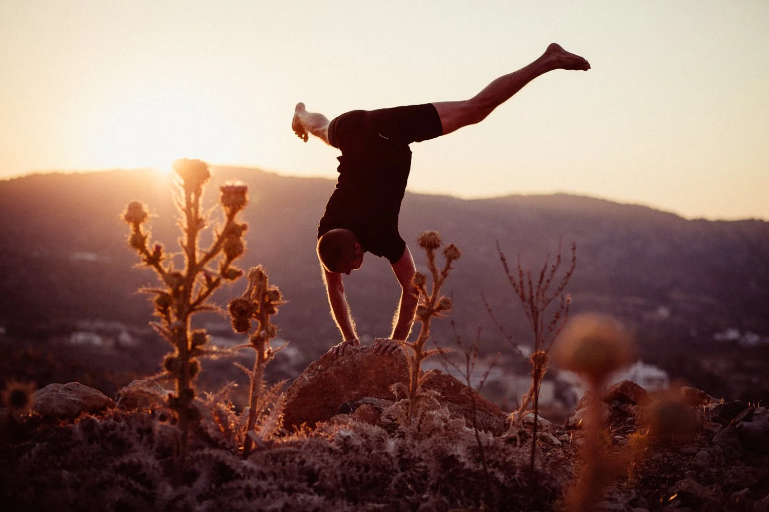 Mann macht Handstand im Sonnenuntergang Rhodos